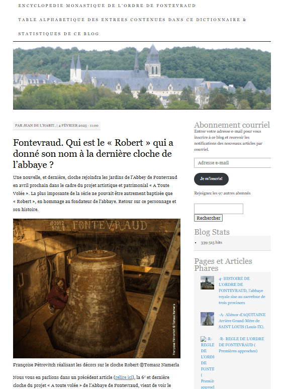 Dictionnaire Ordre Monastique de Fontevraud Site intéressant que je vous conseille sur l’ordre monastique de Fontevraud 👍 https://dictionnaireordremonastiquedefontevraud.wordpress.com En savoir plus sur Prieurés fontevristes Abonnez-vous pour recevoir les derniers articles par e-mail. Saisissez votre adresse e-mail… Abonnez-vous Partager: Partager sur X(ouvre dans une nouvelle fenêtre) X Partager sur Facebook(ouvre dans une nouvelle fenêtre) Facebook J’aime chargement… Articles similaires