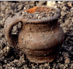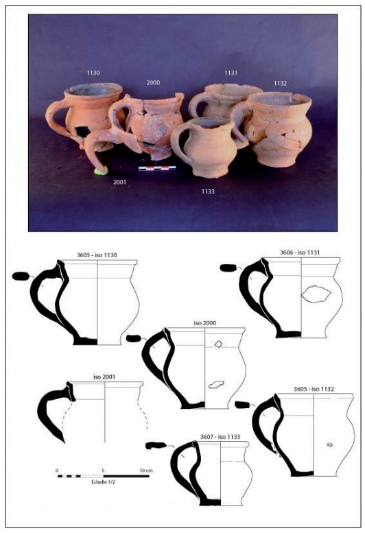 «Six vases funéraires de petites dimensions et en relation avec cette sépulture ont été mis au jour. Ces vases archéologiquement complets sont pour la plupart brisés (sauf un) (photo). Selon l’étude réalisée par Sébastien Jesset, il s’agit de pots ansés (céramique commune à pâte brute, sans glaçure). Certains percés par de petits trous, présentent des traces de charbon de bois et sont qualifiés par les archéologues de «vase à encens» [74].