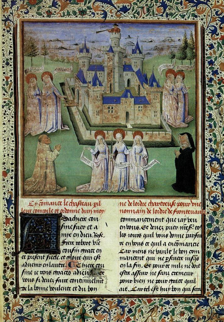 Surtout des manuscrits en français de la piété « moderne », mais aussi des livres de cour comme « La cité des dames » de Christine de Pisan ou le « Mortifiement de vaine plaisir » de René d’Anjou. Cet ensemble montre la bibliothèque d’une grande dame plus soucieuse de progrès spirituel que de culture humaniste ou de délassements mondains. Parmi ses livres, Marie de Bretagne possédait deux exemplaires, aujourd’hui non conservé, d’un traité moral et allégorique intitulé « Le Chastel périlleux », écrit pour une certaine Rose, moniale à Fontevraud. L’auteur, moine chartreux dans la deuxième moitié du XIVe siècle, écrit à la destinataire de l’œuvre : « Pour ce, doulce cousine…ay je propos… de vous enseigner…a faire et a fonder de vous et de votre cuer un chastel si fort contre les ennemis et si bel et si bien garni par dedens que le doux roy Jhesu Christ, vray espoux des santes ames et des bonnes nonnains, y daigne habiter et demeurer delicieusement ».