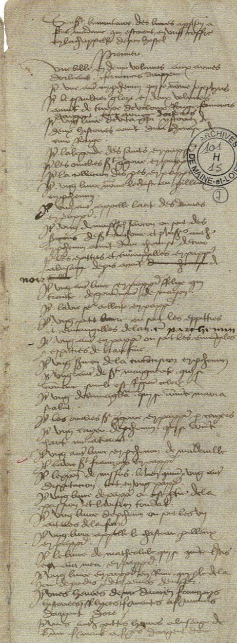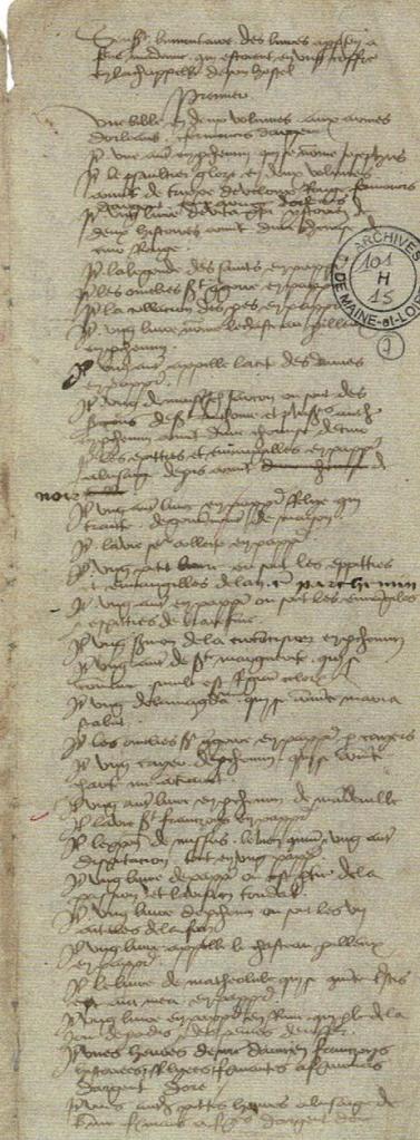 Lors de la mort de Marie de Bretagne en 1477, ses biens font l’objet d’un inventaire, aujourd’hui conservé aux Archives départementales du Maine-et-Loire (photo)[78]. Cet inventaire se compose de trois parties: l’inventaire des meubles, l’inventaire des livres qui se trouvent dans son coffre, et l’inventaire de « XII autres livres, que cahiers, que relient entre deux aisz, le tout en parchemin« .
