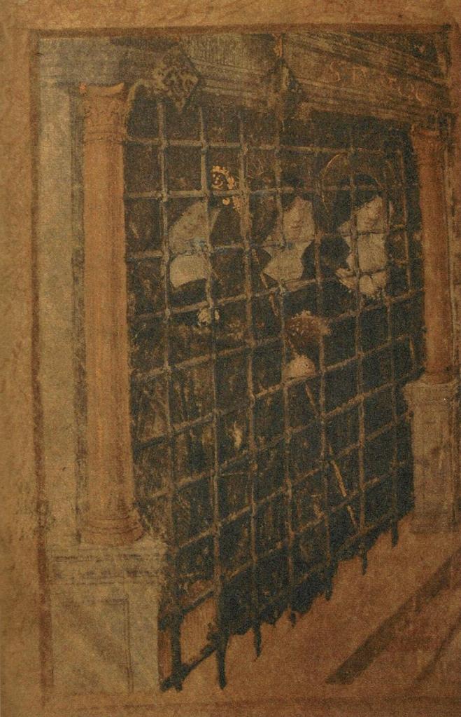 À l’intérieur d’un cadre doré, trois religieuses en habit noir et guimpe blanche debout derrière une lourde grille de fer. À droite une moniale au visage ceint d’une auréole est Sainte-Eustoche, identifiée par la légende placée au-dessus d’elle. Celle du centre est une abbesse, reconnaissable à sa crosse, est désignée par les armoiries familiales accrochées au cadre. L’écu losangé placé au-dessus de l’abbesse porte les armes parties de Bretagne et d’Orléans/Visconti et désigne sans contexte Marie de Bretagne. La religieuse placée à gauche, est d’après l’écu, une descendante de la famille angevine des Beauvau, sans doute Marguerite de Beauvau, une des compagnes de Marie de Bretagne.