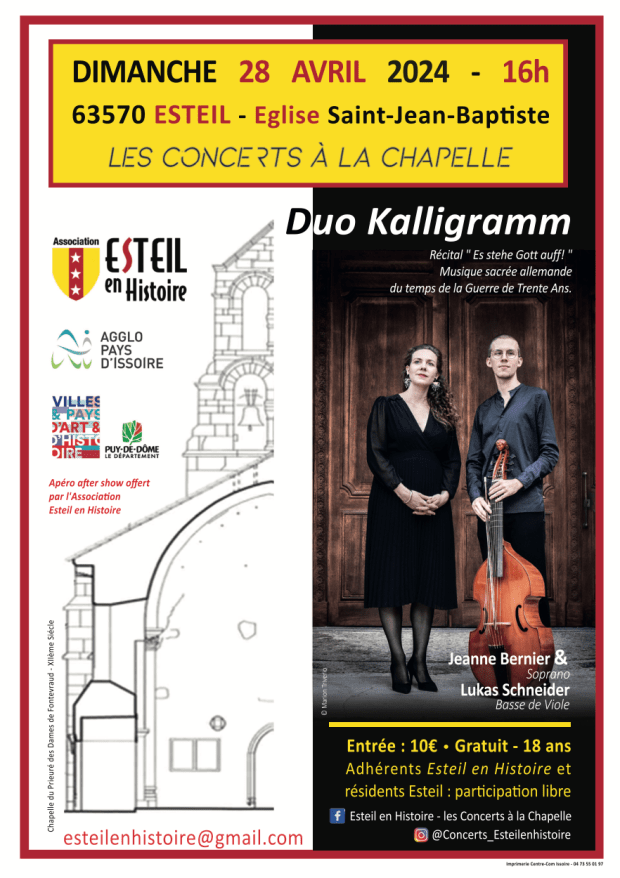 Rendez-vous le dimanche 28 avril 2024, à 16h00, avec le Duo Kalligramm emmené par Jeanne Barnier – soprano & Lukas Schneider – basse de viole dans un récital « Es stehe Gott auff ! » de musique sacrée allemande du temps de la Guerre de Trente Ans. De quoi bien démarrer la saison à la chapelle d’Esteil avec un retour en pleine moitié du 17e siècle sur des histoires de religions ! Mais, en musique chantée.