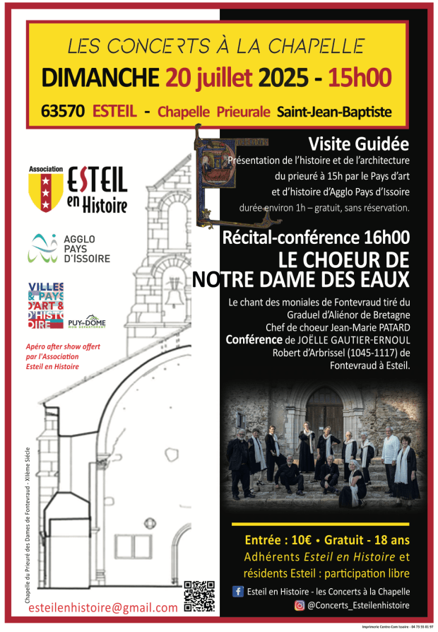 Les Concerts à la Chapelle d’Esteil s’offrent comme une formidable opportunité de sortie au grand air sur notre merveilleux belvédère du Livradois, en famille, entre amis et voisins les dimanches après-midi. Pour une heure de promenade ou rando autour de notre volcan (-20 millions d’années), un pique-nique tiré du sac campé face aux nombreux points de vue remarquables, suivi dans l’émotion et l’enchantement musical des Concerts à la Chapelle, au sein de l’héritage patrimonial millénaire de notre village, la chapelle prieurale d’Esteil XIIe. Plaisirs et émotions prolongés autour d’un buffet d’après concert offert, pour des échanges, des rencontres, entre le public en présence des artistes.