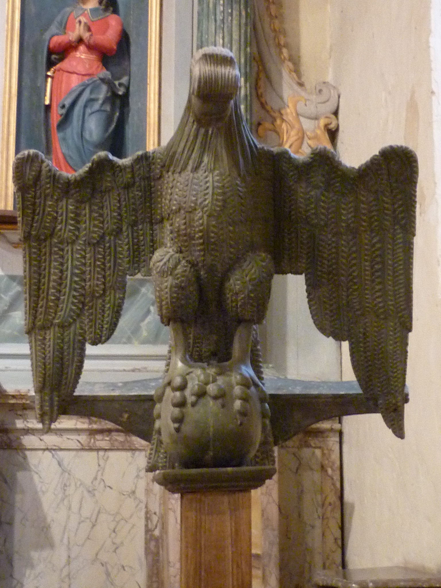 Lutrin, bois sculpté. Photo JGE 2020