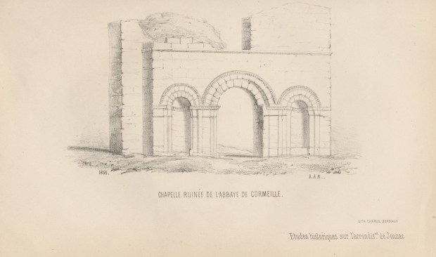 « À l’ouest du bourg et au fond d’une vallée solitaire, sur la rive gauche de la Seudre, lieu admirablement choisi pour la vie contemplative, on voyait encore au commencement de ce siècle (XIXe s.), les imposantes ruines de l’abbaye de Cormeilles, ordre de Fontevraud »[4].