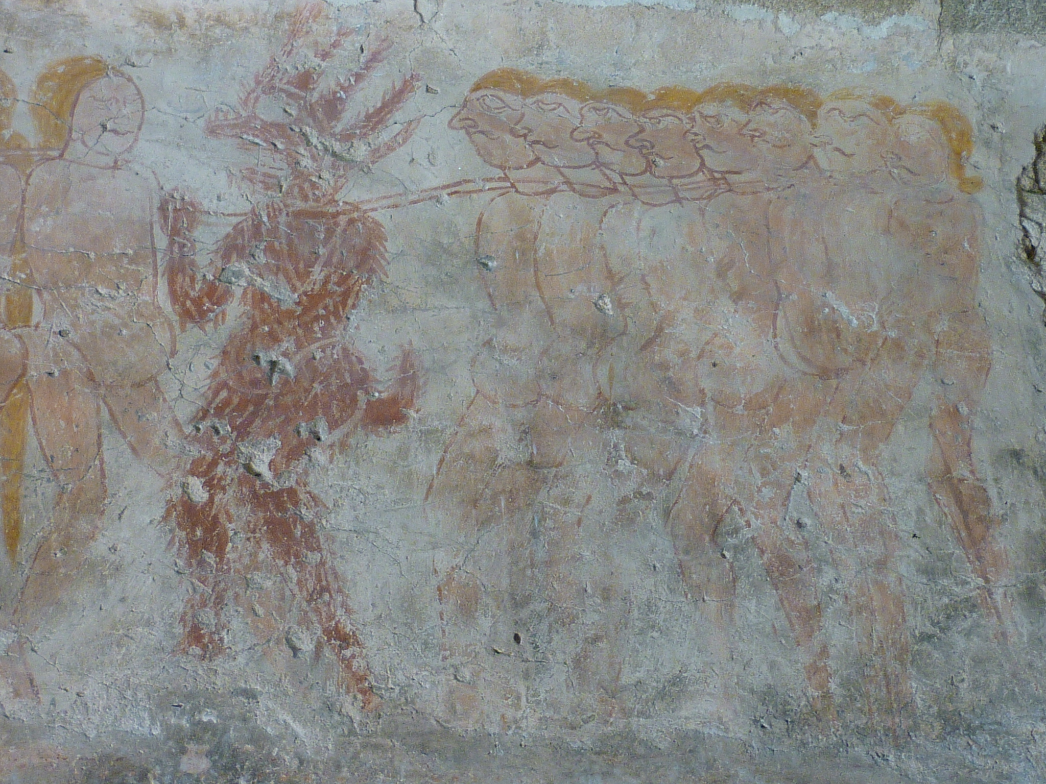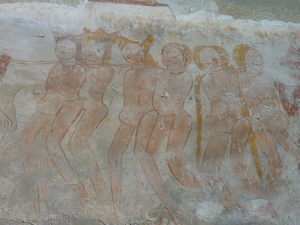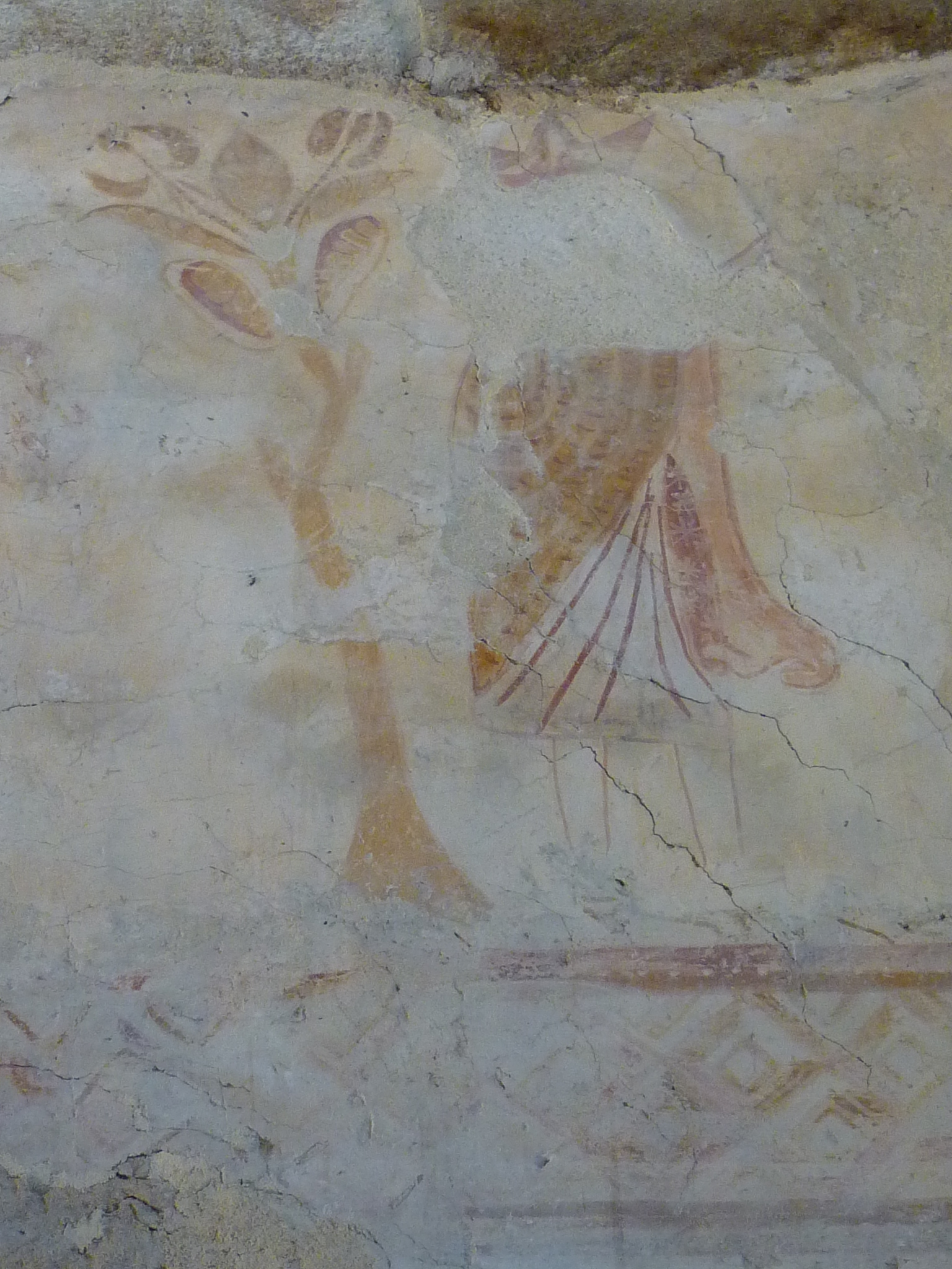Sur les murs est et nord de la chapelle, Scène biblique (Jugement dernier, diable, Damné), scène (personnage : assis, table : ?), scène (cheval, homme, arbre), figure biblique (Christ : tête), ornementation (ruban plissé, ornement à forme géométrique). Mauvais état, œuvre menacée, fragment. Plusieurs scènes sont difficilement lisibles ; les peintures du mur est sont presque complètement effacées. 4ème quart XIIe siècle, 1er quart XIIIe siècle[33].