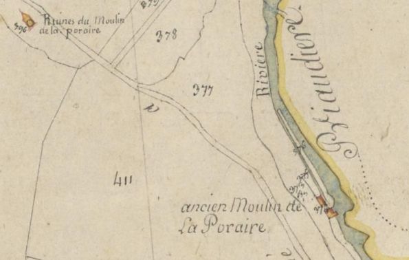 Plan cadastral : 1811, 3 P 68/3 : le moulin de La Poraire au bord du Thouaret, La Poraire au bord du ruisseau du même nom