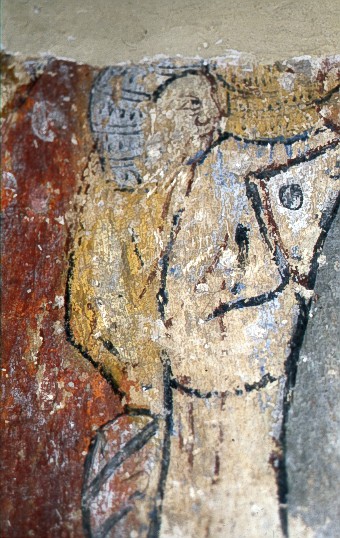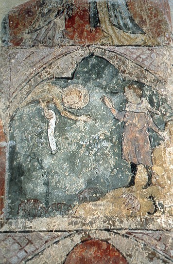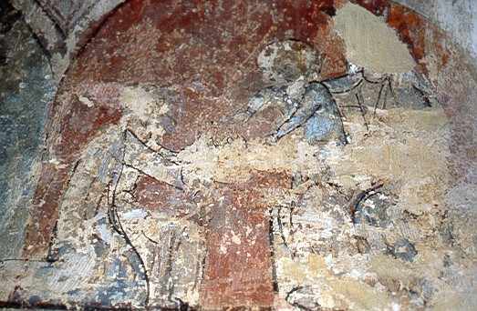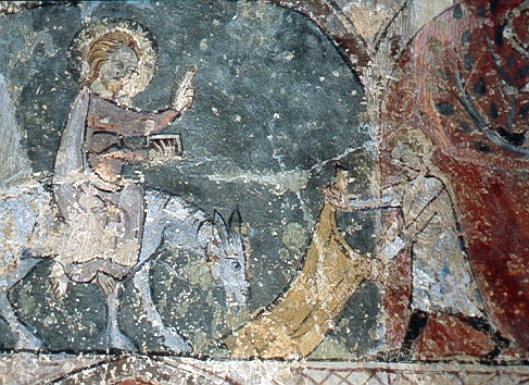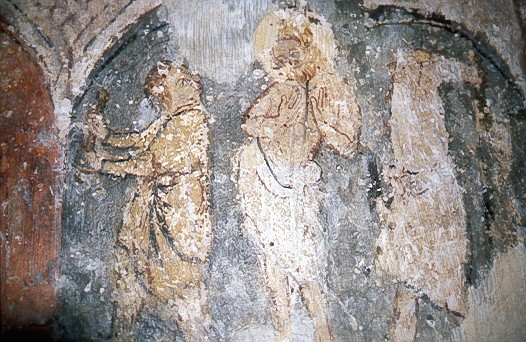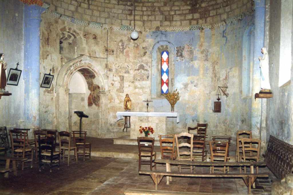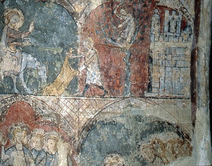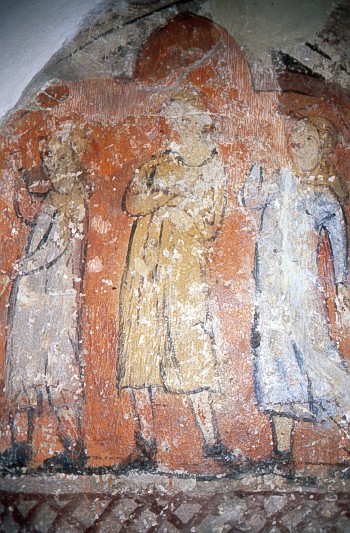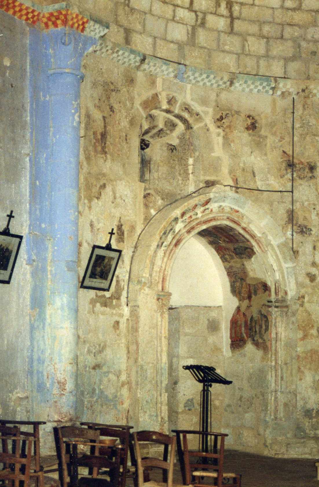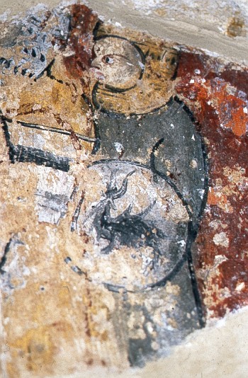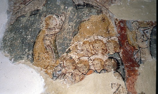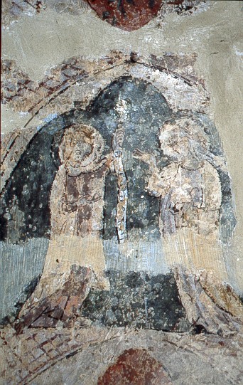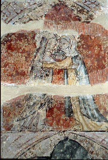 Annonce aux bergers et Visitation, peintures murales XIIIe siècle, église du prieuré fontevriste de Vopillon. Diapo Guy Laborde