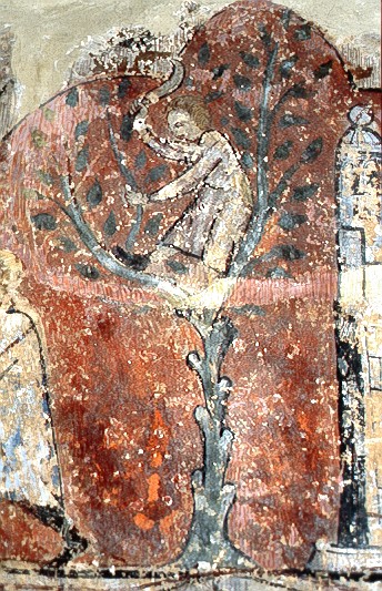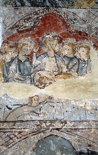 Il faut déplorer la destruction des peintures au-dessus des apôtres dans la Cène. Jésus et les apôtres (au nombre de cinq en raison du manque de place) sont du même côté d’une table couverte d’une nappe bleue. Jésus seul est représenté de face, les apôtres sont disposés de biais, les uns contre les autres. Ils sont nimbés. Le regard des apôtres placés à gauche du Christ convergent vers ce dernier, ceux des apôtres situés à droite se dirigent vers Judas.