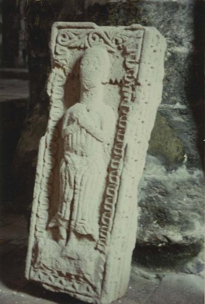 « Bras repliés et croisés sur la poitrine, vêtu d’une tunique ne laissant paraître que les pieds, le gisant est entouré d’un répertoire varié de frises sculptées Mal à l’aise dans la représentation naïve et maladroite du corps humain et dans celle des drapés, le sculpteur donne libre cours à son imagination dans un vocabulaire d’esprit très roman, inhabituel sur ce type de monument : étoiles sous les pieds, entrelacs au-dessus de la tête, feuilles d’eau le long des grands côtés et frise continue d’arc plein cintre sur l’épaisseur de la pierre. Sous les pieds, une plaque rectangulaire bûchée fournissait, peut-être, une solution à cette œuvre rare et énigmatique ».