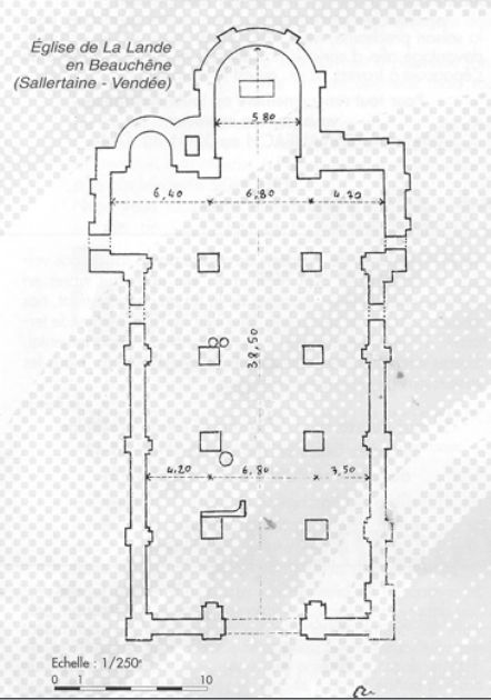 En 1968 : « Cet enclos n’était pas très différent de ce qu’il est actuellement mais il était envahi par les ronces et les orties. Il fut décidé de le nettoyer et même de le labourer. Nous savions que c’était l’église et nous avons pensé qu’il pouvait y avoir une crypte. Mais la charrue n’a découvert aucun escalier. Pas de crypte ! Cependant la charrue a heurté une pierre tombale près du chœur. Je me souviens d’avoir appelé de Dr Julien Rousseau pour qu’il vienne l’examiner. Sous la pierre tombale, nous avons découvert un squelette. Il s’agissait d’un homme qui mesurait 1.78 mètre et que le Dr Rousseau présumait être Pierre V, seigneur de la Garnache. La Lande-en-Beauchêne était le lieu d’inhumation de la famille du fondateur, Pierre II, ainsi que de quelques autres personnes importantes, dont Hugues de Thouars, le premier mari de Marguerite de Belleville, enterré en 1228, qui fit de nombreux et importants dons aux moniales»[56].