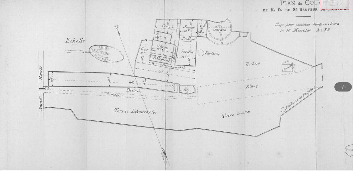 25 avril 1792 ; P.V. d’adjudication d’un jardin en 2 appelé le jardin du Prieuré avec les bâtiments dépendant du couvent des religieuses fontevristes de Montaigu, à Jacques Musset de Montaigu pour la somme de 4700 livres[44].